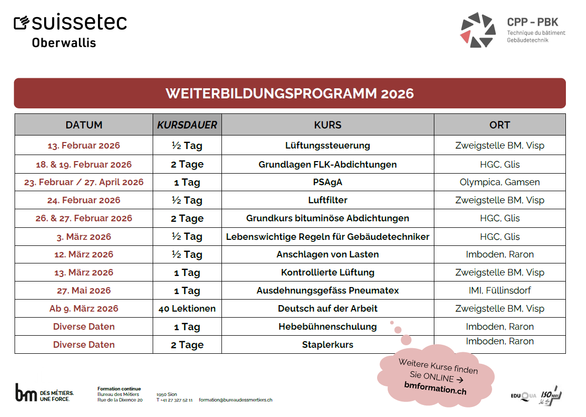 Das Kursangebot für die Gebäudetechnikberufe ist beim Bureau des Métiers zu finden.